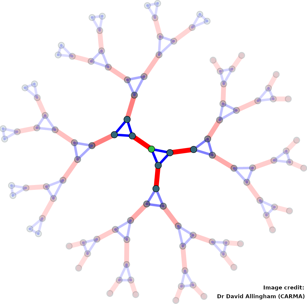 Symmetries of networks (or graphs) are '$0$-dimensional', and such symmetries are investigated through the algebraic technique of totally disconnected, locally compact groups. We are interested in highly symmetric, infinite graphs and one way to form such graphs is by gluing together infinitely many copies of finite graphs according to some regular instructions. This project investigates the symmetry groups of examples of graphs formed in this way and compares them with the symmetry groups of infinite regular trees, which are the most basic type of infinite regular graph. The aim is to determine whether the symmetry groups obtained in this way are simple and new. Students taking this project will extend their knowledge of algebra, analysis and combinatorics. 'Totally disconnected' and 'locally compact' are topological notions; 'group' and 'simple' are algebraic ones; and 'graphs' are a combinatorial concept. |