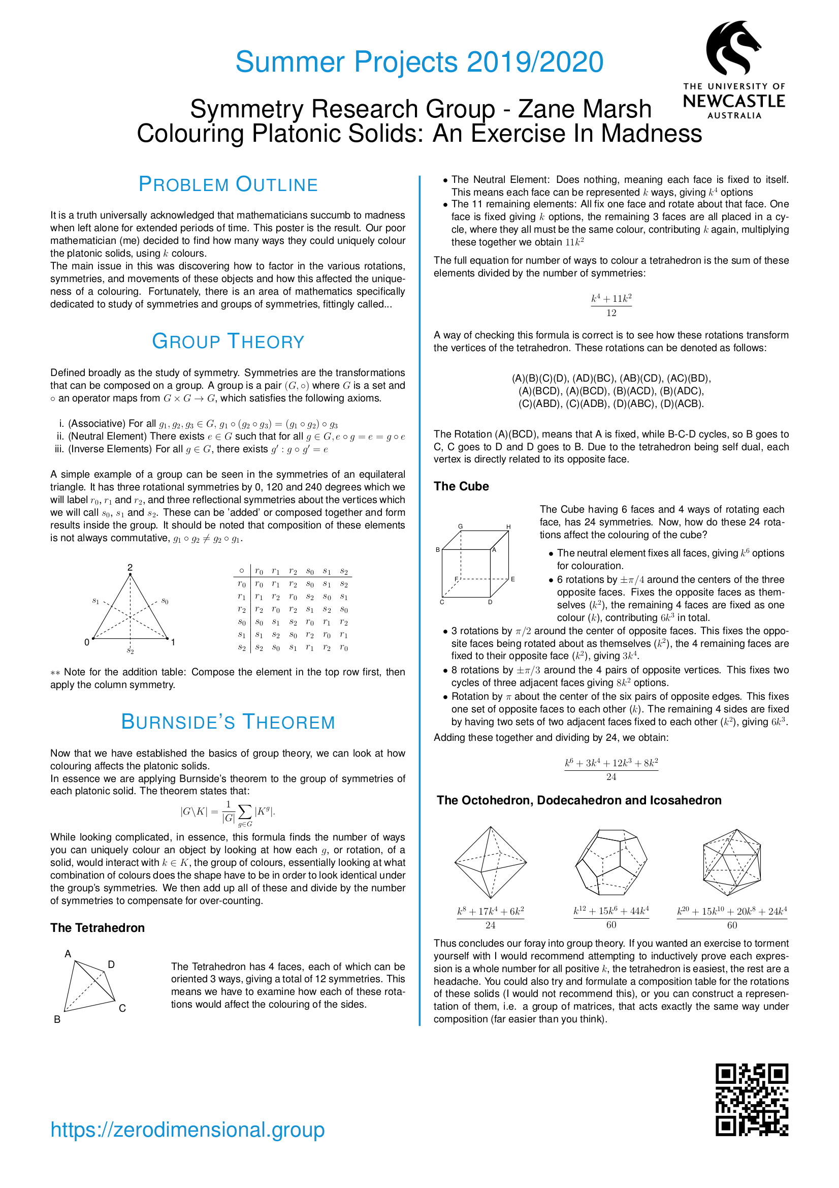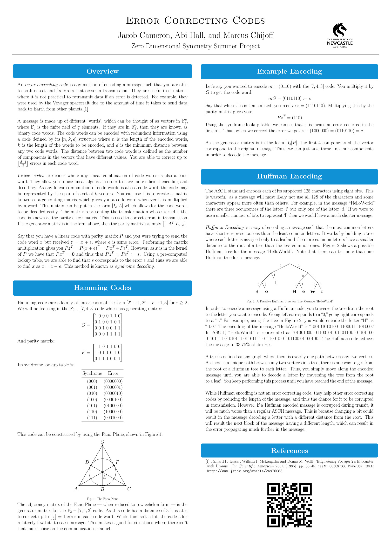 In this summer project, the above first-year students explored the mathematical formalisation of the everyday notion of symmetry, which is the algebraic concept of a 'group'. Using groups, we are able to state with certainty whether a given puzzle can be solved (the 15-puzzle can not!) and, if so, compute how many steps are needed. As an example of the far-reaching applicability of this concept, we look into error-correcting codes, such as the Golay code, which are critical in any digital communication, including NASA's Voyager program. Apart from theoretical studies in the area of groups, projects included the design, analysis and implementation of codes.
