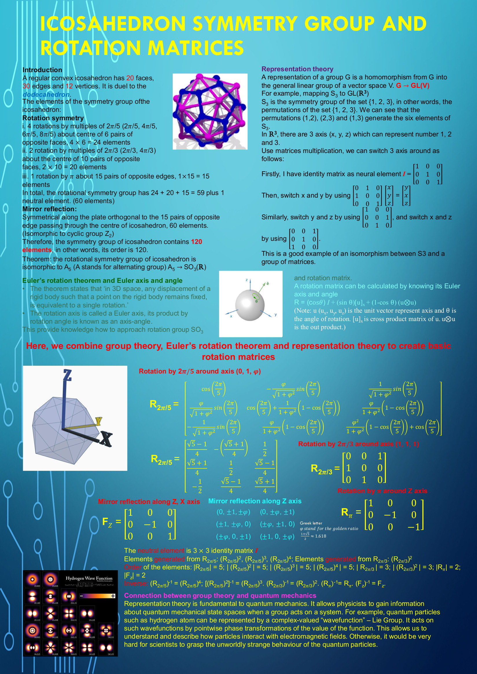 The project involves finding alternative ways of visualising self-similar permutation groups that improve our ability to see patterns among them. Several thousand of these groups, which act on binary trees, have been generated by computer searches. However, the action on the tree is often not illuminating and we seek geometric actions that convey more visual information. For example, given certain permutations of four points, our understanding of the permutations is greatly enhanced if we see that the four points are in fact the vertices of a square and the permutations come from rotations and reflections of the square. Our goal is to `join the dots’ and see geometric patterns in the computer generated cases we have found currently. The approach will again use a computer search. Knowledge of a second-year linear algebra or third-year algebra course is assumed, and knowledge of computing is desirable. Students will learn more algebra and also gain experience working with computer algebra systems. It is possible that work from this project will eventually be included in publicly available computer algebra packages. The project contributes to a much larger one that aims to understand symmetry groups of infinite networks, and students will also learn about this larger project.
